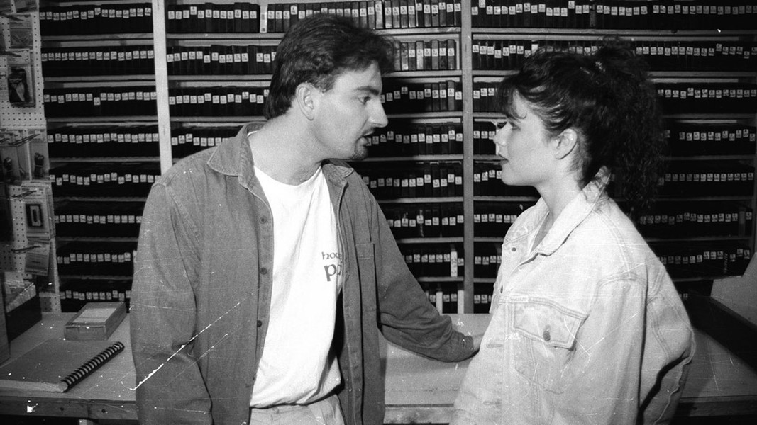 Americký režisér Kevin Smith (nar. 1970) patří mezi nejvýraznější postavy současného nezávislého filmu. Proslavil se tzv. newjerseyskou trilogií, jejíž první částí je právě jeho debut Mladí muži za pultem (dalšími jsou Flákači a Hledám Amy). Černobíle natočený příběh jednoho dne v životě prodavače Danteho (Brian O´Halloran) a jeho kamaráda z protější videopůjčovny Randala (Jeff Anderson) je v podstatě záznamem jejich přerušovaného dialogu na nejrozličnější témata, od sexuálních vztahů přes oblíbené filmy až po nejrůznější druhy bizarních zákazníků, s nimiž se setkávají. K bezprostřednosti snímku přispívají herecké výkony vesměs nezávislých představitelů i zrnitý obraz (vzniklý překopírováním z 16mm negativu). Ve filmu se také objevuje dvojice postav, která prochází celým Smithovým dílem – neuvěřitelně sprostý drogový dealer Jay (Jason Mewes) a jeho kamarád Mlčenlivej Bob (hraje ho sám režisér). Film vznikal s minimálním rozpočtem – údajně víc než vlastní výrobní náklady (22 000 dolarů) činila práva na použitou hudbu (27 000 dolarů), což je v současné kinematografii (i nezávislé) neobvyklá rarita. Mladí muži za pultem získali řadu festivalových vavřínů, mj. Cenu diváků na MFF v Deauville a tři nominace na Independent Spirit Award (nejvyšší americké ocenění nezávislého filmu) – za herecký debut (Jeff Anderson), první scénář (Kevin Smith) a první film (Scott Mosier, K. Smith).