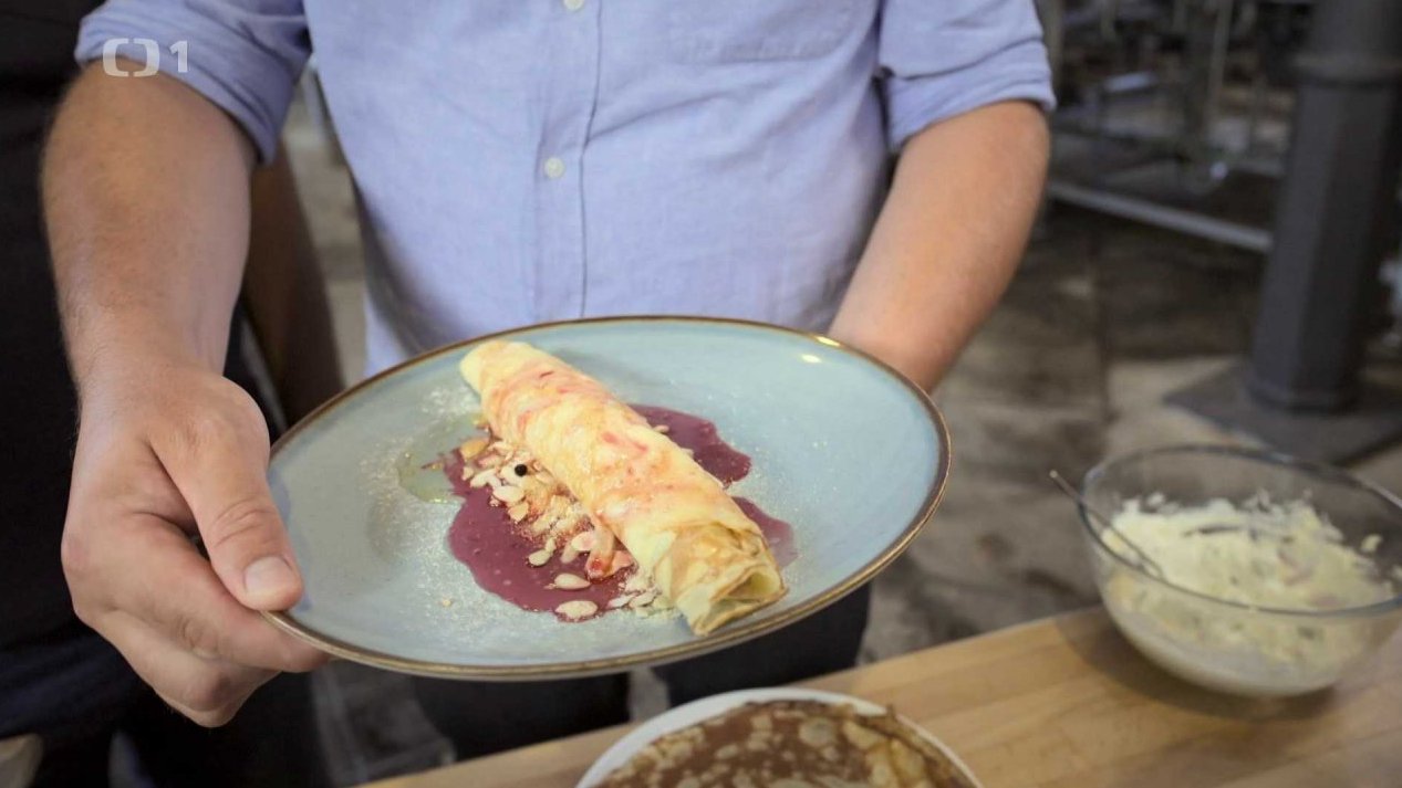 Palačinky plněné vanilkovým tvarohem s rozinkami, pražená strouhanka s mandlemi a levandulový sirup