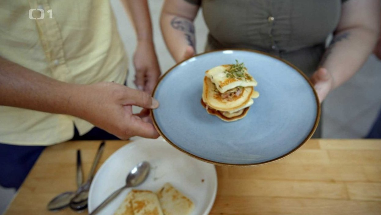 Sýr na grilování nakrájíme na kousky a opečeme na pánvi. Hotové lívance vrstvíme s cuketovo-slaninovou vložkou a grilovaným sýrem. Zdobíme bylinkami a řeřichou.
