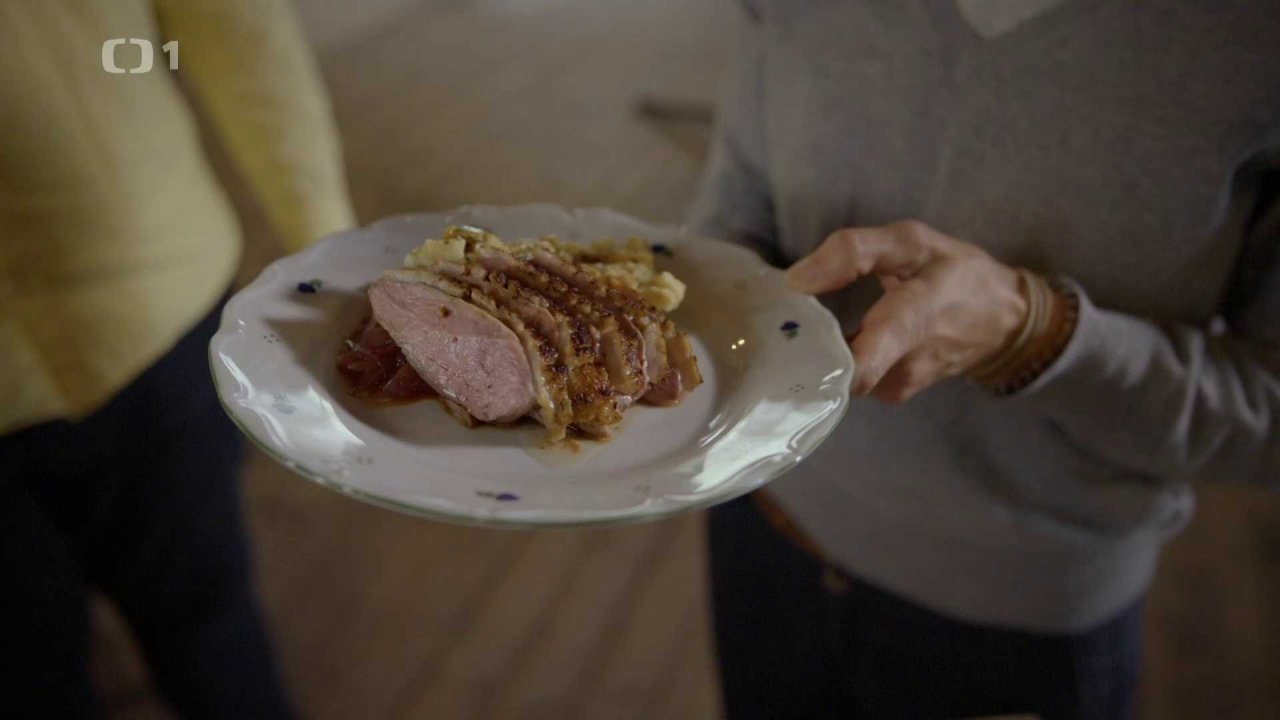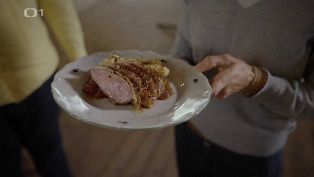 Kachní prso marinované v zázvorovém likéru, cibulové želé a nádivka z pánve