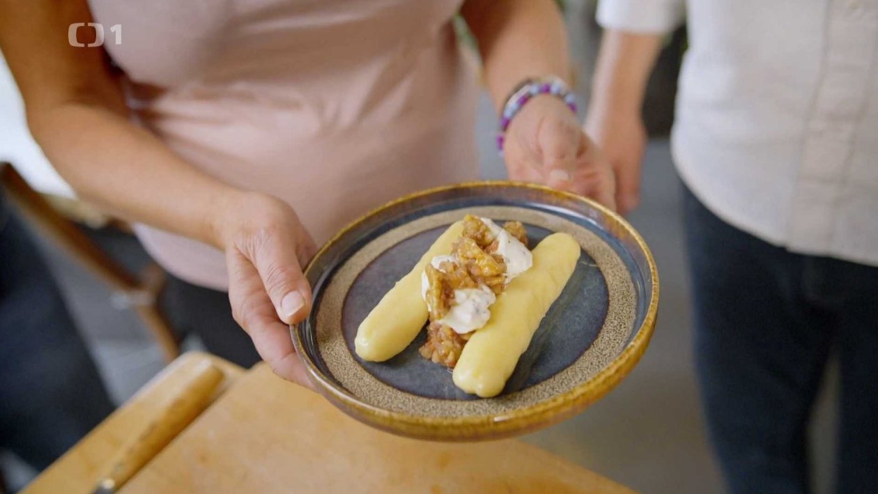 Bramborové noky s kozím tvarohem, vanilkou a tymiánem, doplněné jablečnými a slaninovými kostičkami