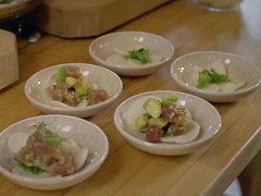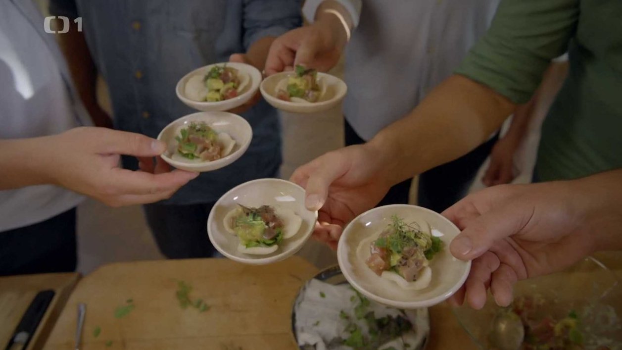 Očištěnou a dobře vychlazenou rybu nakrájíme na kostičky, stejně tak avokádo. Smícháme s olivovým olejem, najemno nakrájenou šalotkou a koriandrem. Dochutíme solí, pepřem a limetovou šťávou a kůrou, ponzu a sweet chilli omáčkou. Promícháme a podáváme na krevetovém chipsu, ozdobíme microgreens nebo řebříčkem a praženým sezamem.