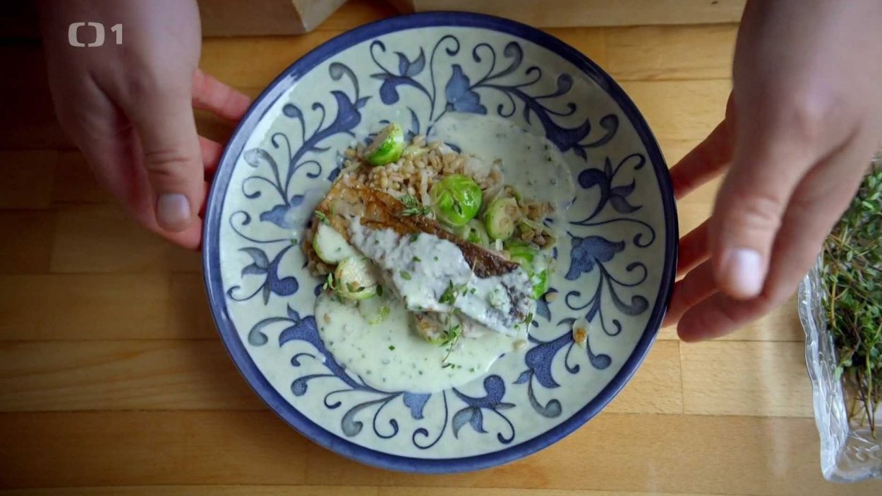 Marinovaný kapr v bylinkách, omáčka ze zákysu a kroupy se zelím a růžičkovou kapustou