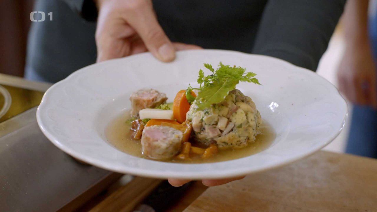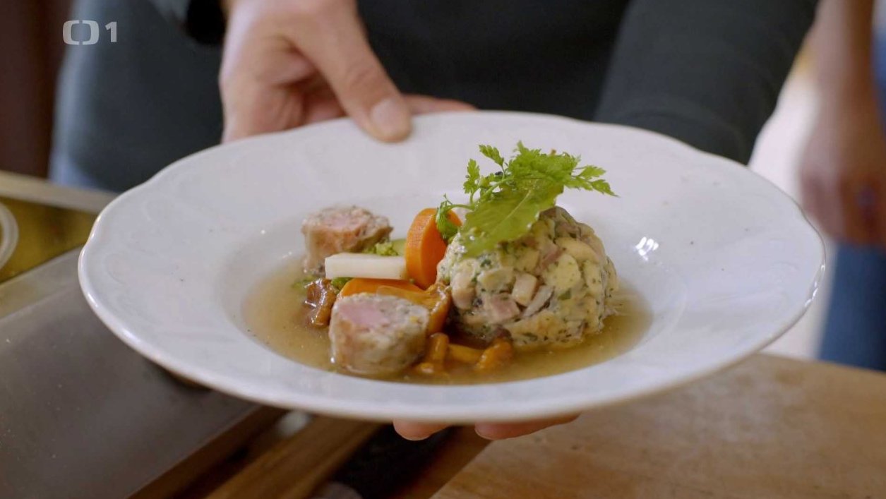 Vývar z uzeného masa s kořenovou zeleninou, žemlový knedlík a krepinetka z uzeného masa