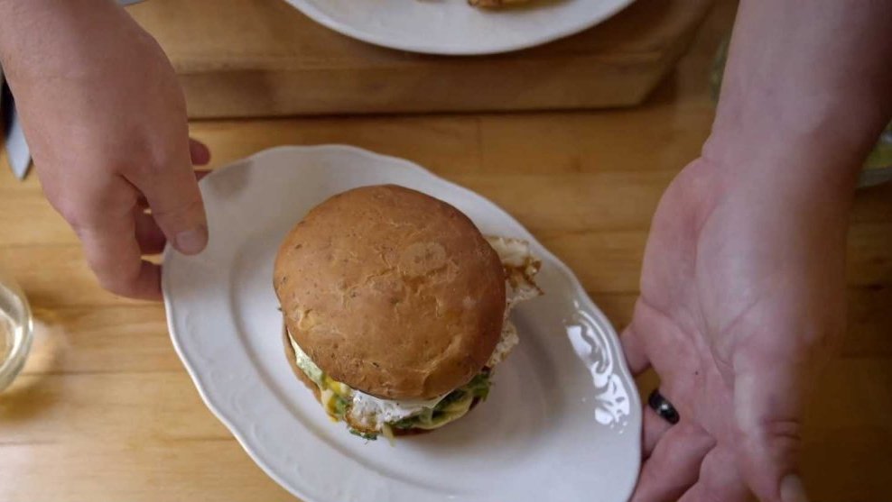 Hotové a vychladlé housky rozkrojíme, potřeme naší majonézou, přidáme teplý salátek ze špičatého zelí, hotový burger, nakonec volské oko a přiklopíme druhou polovinou housky, taktéž potřenou naší majonézou.