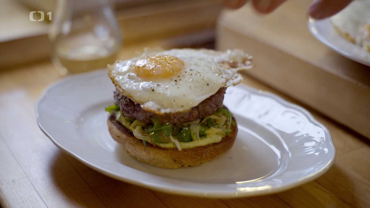 Na pánvi opečeme jednotlivé burgery. Poté ještě 4 volská oka.