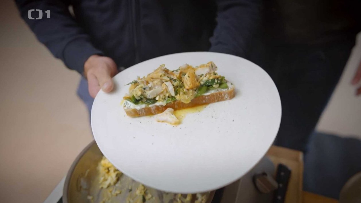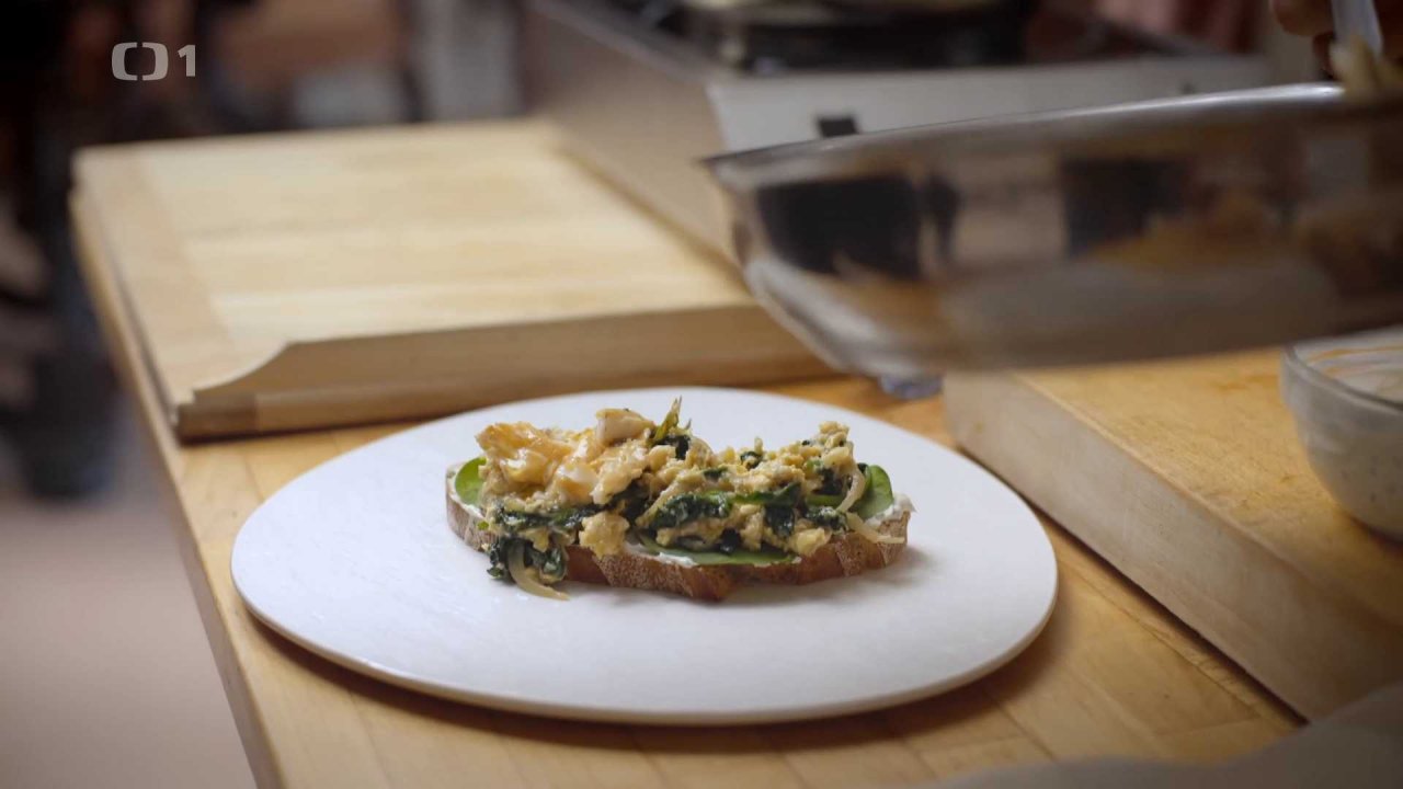 Připravíme si plátky chleba, potřeme ochuceným žervé, poklademe lístky špenátu, na to vrstvíme směs s vejci a špenátem, a nakonec přidáme plátek uzeného candáta.