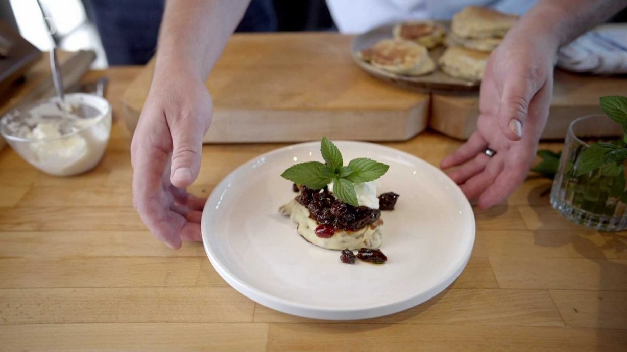 Servírujeme lívance přelité rozvarem, ozdobené lžící crème fraîche a pár lístky máty.