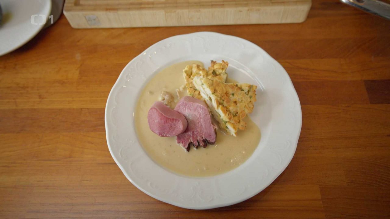Uzený jazyk, houbová omáčka, petrželová nádivka