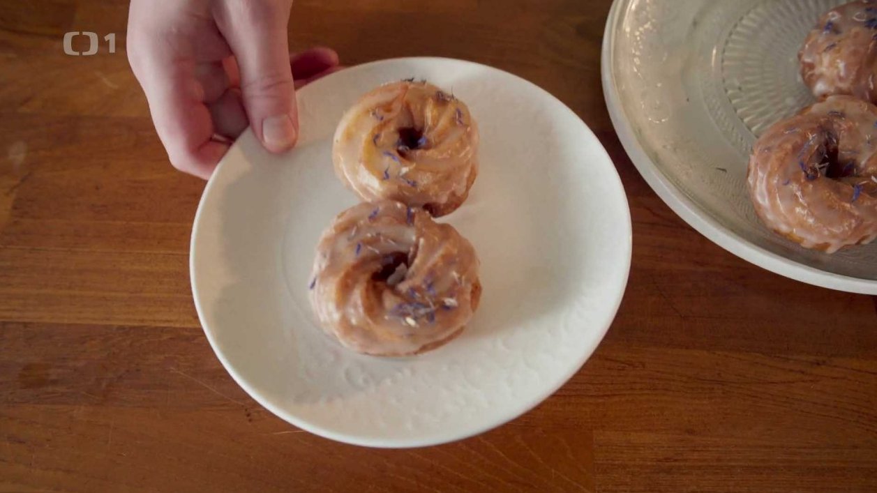 Suroviny na polevu si rozmícháme v míse a v ní máčíme jednotlivé věnečky. Zdobíme jedlými lístky, např. chrpy.