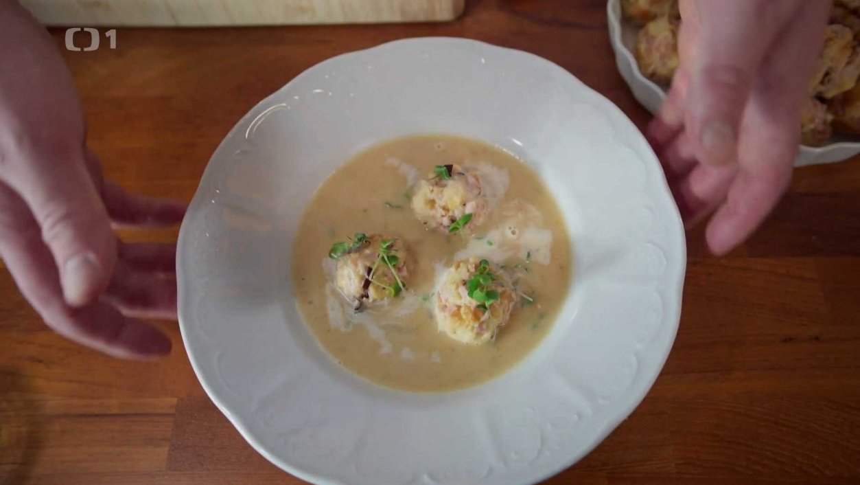 Žlutý hrách namočíme ve studené vodě. Rohlíky nakrájíme na kostičky, uzené maso nakrájíme na velmi drobné kostičky a obojí vsypeme do mísy. Přidáme žloutky, mléko, muškátový květ a sůl a lžící promícháme. Z bílků vedle v míse vyšleháme lehce tekutý sníh, ten nakonec přidáme do směsi také a vše společně promícháme a prohněteme. Ze směsi tvarujeme knedlíčky, které vaříme v páře asi 6–10 minut.