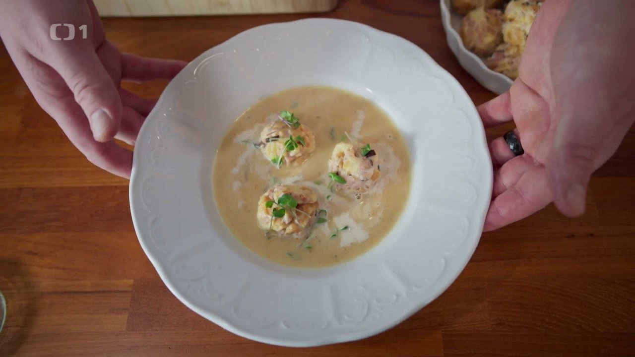 Mrkev, řapíkatý celer a červenou cibuli nakrájíme na drobné kostičky, česnek na tenké plátky, a to vše opečeme v hrnci na másle a oleji. Po chvíli přidáme lístky šalvěje, namočený žlutý hrách a zalijeme vývarem. Zavaříme doměkka. Můžeme osolit. Po uvaření rozmixujeme, zjemníme smetanou a dochutíme dle potřeby. Servírujeme s uvařenými knedlíčky a můžeme dozdobit například klíčky ředkvičky.