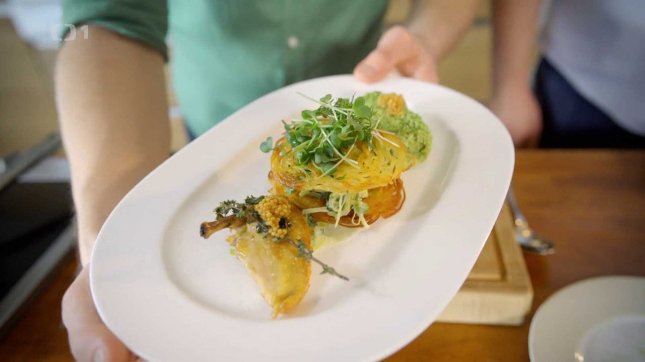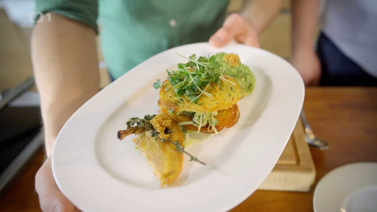 Servírujeme krémový pórek, na něj bramborové rösti, další vrstvu krémového pórku i s brokolicí, překryjeme opět bramborovým rösti, na které nasypeme jarní kličky a na talíř vložíme kuřecí prso i kuřecí roládku. Dozdobíme hrubozrnnou hořčicí.