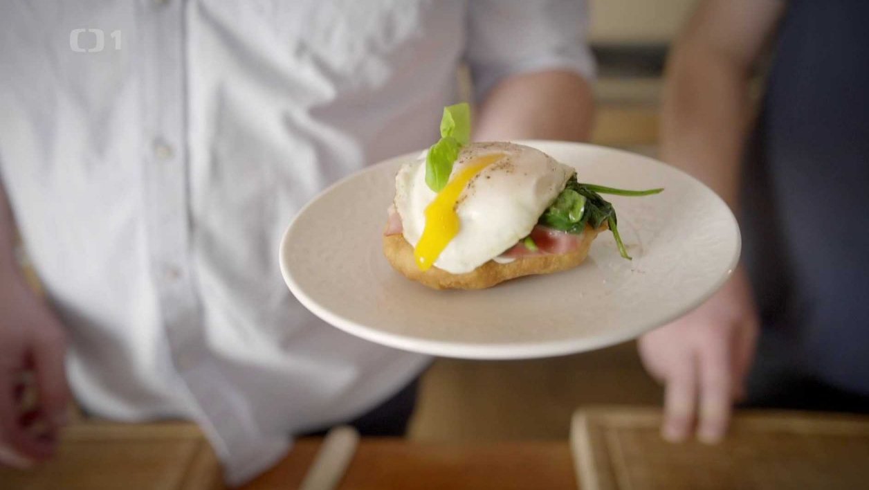 Langoš se špenátem, slaninou a sázeným vejcem
