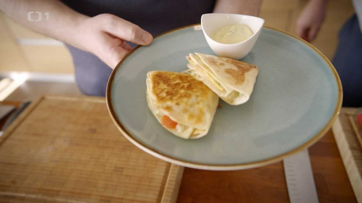 Každou tortillu rozdělíme vizuálně na čtvrtiny. Jednu čtvrtinu nakrojíme nožem. Položíme na ni část vaječné omelety a přeložíme ji další částí tortilly. Na tu pak dáme nakrájený ledový salát a rajčátka, opět přeložíme a na poslední část dáme vrstvu nastrouhaných sýrů a přiklopíme naposled. Tím si vytvoříme krásnou kapsu, kterou ještě krátce opečeme na másle na pánvi, aby se sýr hezky roztekl a tortilla byla křupavá.