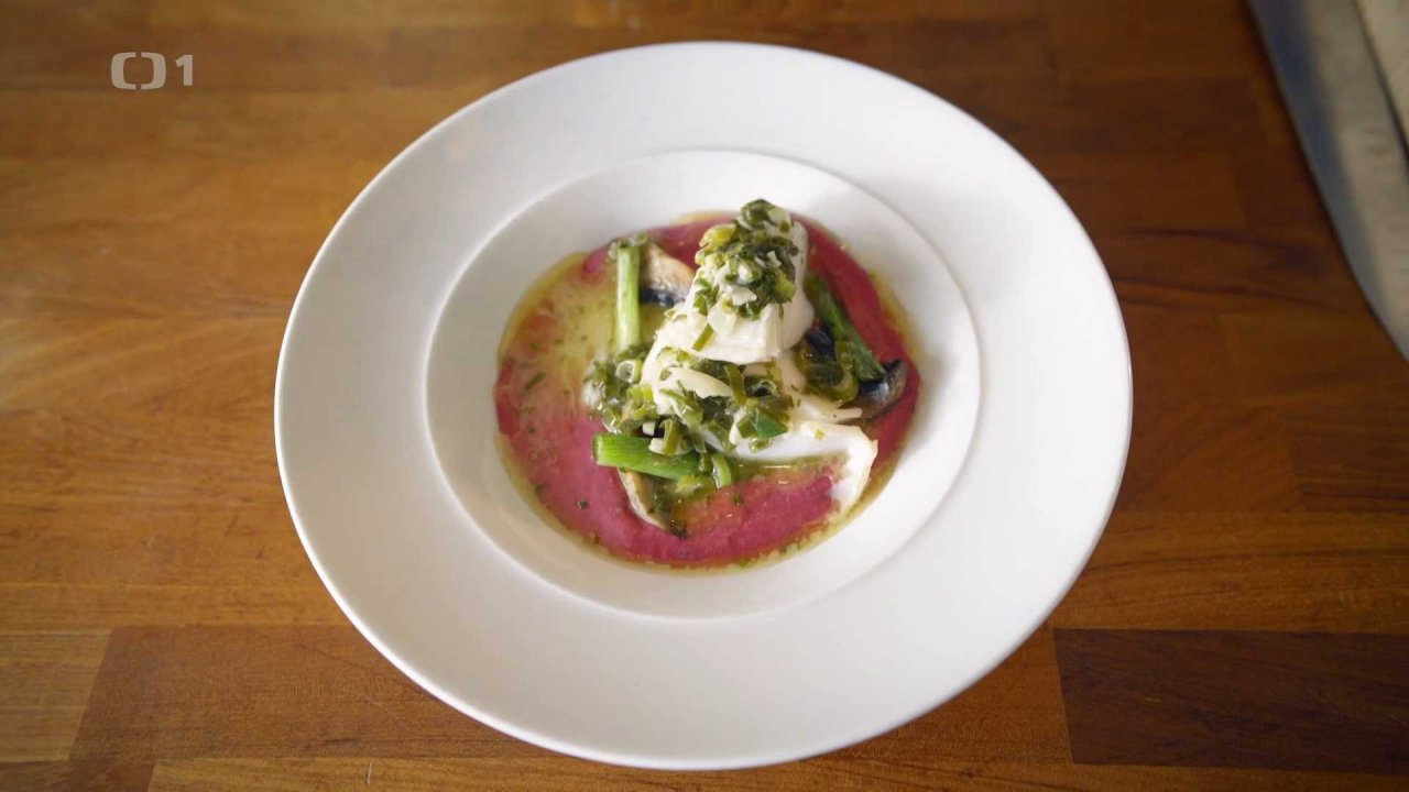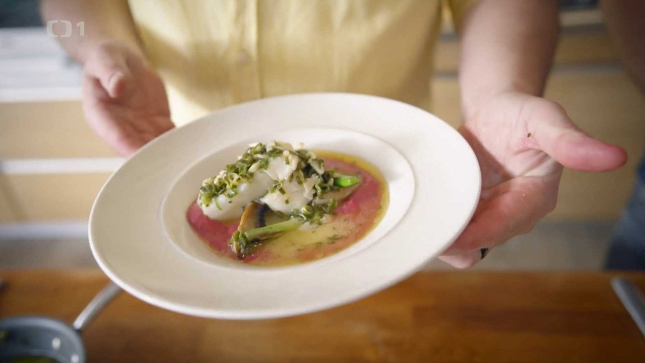Pošírovaná treska a pyré z červené řepy a bílých fazolí