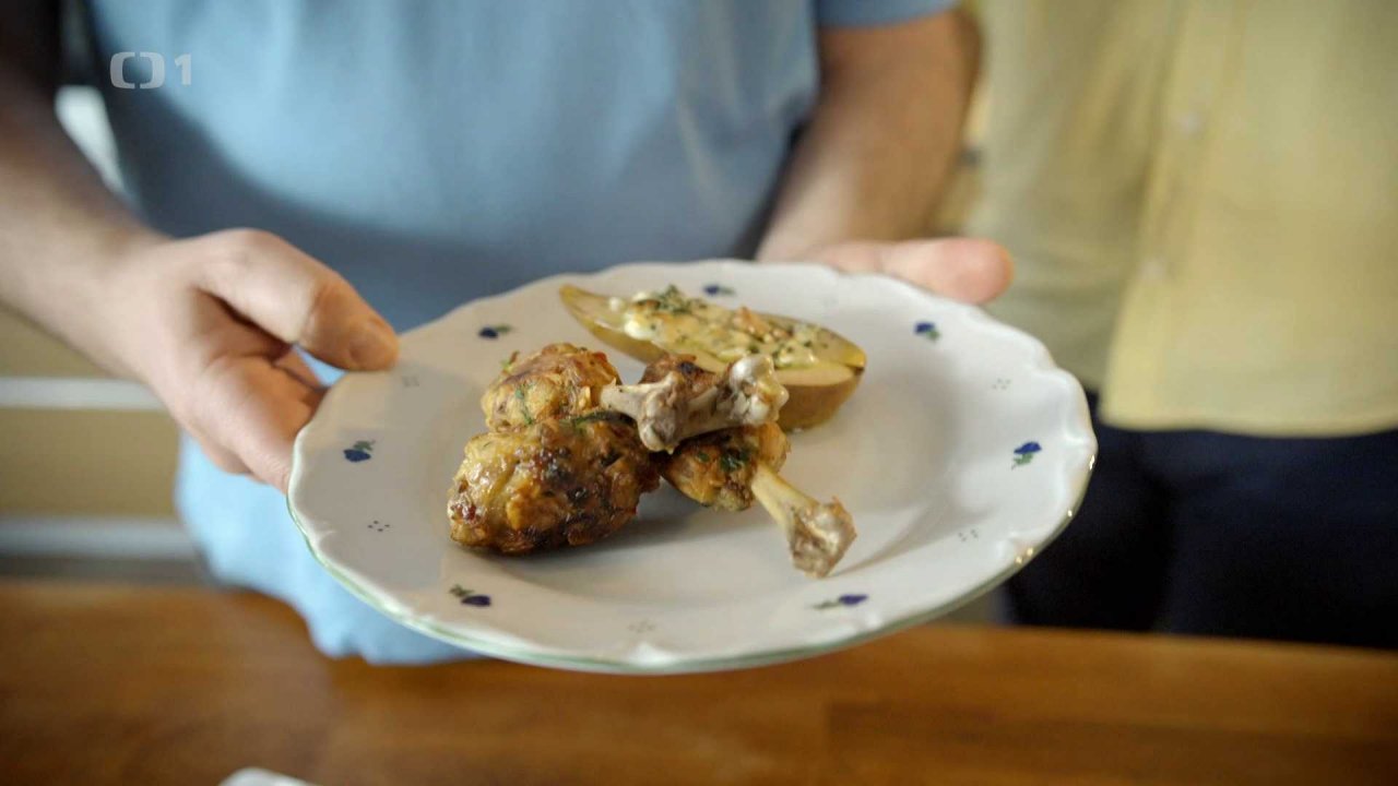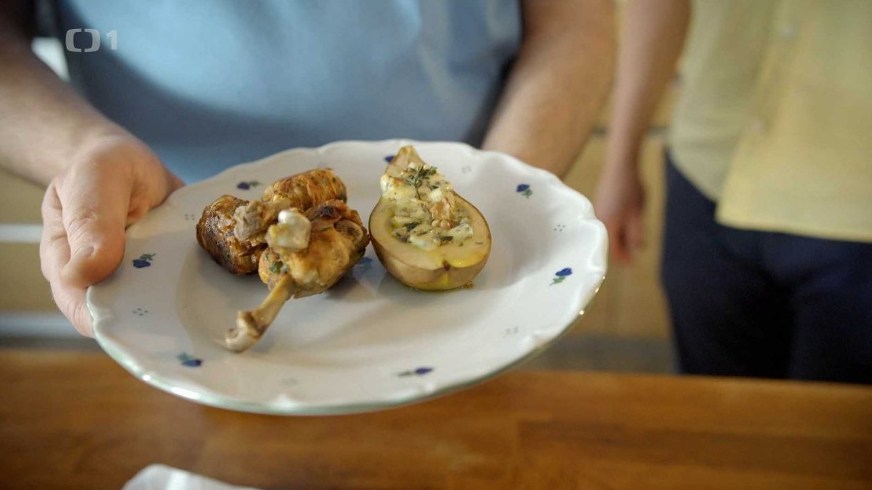 Kuřecí paličky s mandlemi, zázvorem a pečenými hruškami