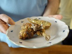 Kuřecí paličky uvaříme v osolené vodě, můžeme přidat plátek zázvoru. Maso z paliček obereme a kosti zachováme. Kuřecí maso nasekáme nadrobno a vložíme do mísy. Hladkolistou petržel a rozinky nasekáme nadrobno, přidáme k masu společně s plátky mandlí a vejcem. Přisypeme koření a sůl. Promícháme a přidáme strouhanku dle potřeby, aby nám vznikla kompaktní hmota. Vezmeme si zpět jednotlivé kosti a vrstvíme hmotu zpět do tvaru paličky. Smažíme na pánvi ve vyšší vrstvě sádla.