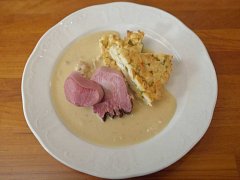 Uzený jazyk, houbová omáčka, petrželová nádivka
