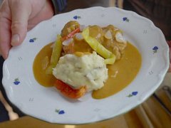 Vepřová líčka na pivu s nakládanou zeleninou, bramborové noky s chlebem