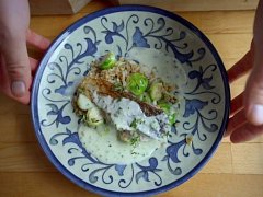 Marinovaný kapr v bylinkách, omáčka ze zákysu a kroupy se zelím a růžičkovou kapustou