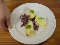 Šťouchané brambory s kapustou, pečená kuřecí játra a cibulová omáčka s džemem