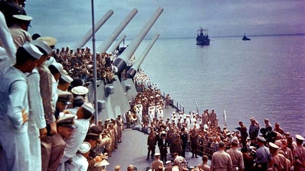 14. srpna 1945 americký prezident Truman oznámil, že obdržel odpověď japonské vlády na poselství, které z Washingtonu odeslali 11. srpna. Tou odpovědí byl souhlas s Postupimskou dohodou, upřesňující podmínky bezpodmínečné kapitulace Japonska. Odpověď z Tokia byla bezvýhradná. Lidé si s úlevou uvědomovali, že konečně bude mír. Vždyť jen od března do července zahynulo v bojích v Pacifiku na třicet tisíc Američanů. Krátce předtím sice atomové bomby zničily Hirošimu a Nagasaki, ale stále ještě nebylo vyhráno. Teprve podpisem generála Mac Arthura a japonského ministra Šigemicu všechna skončilo...