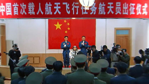 15. října 2003 vstoupila ČLR do exkluzivního klubu zemí, které do vesmíru poslaly loď s lidskou posádkou. Start rakety s prvním čínským kosmonautem, neboli tajkonautem, proběhl tajně. Záznam události odvysílala státní televize teprve až půl hodiny poté, co loď úspěšně dorazila na oběžnou dráhu. Čína zahájila přípravu letu člověka do kosmu už v roce 1971 výběrem vhodných kandidátů z řad vojenských pilotů. Politická situace doby bouřící "kulturní revolucí" však projektu nepřála. Byl obnoven až v roce 1992 za zcela jiné politické a hospodářské situace. Pro výcvik a výběr vhodných kandidátů, opět z řad vojenských pilotů, bylo na okraji Pekingu postaveno vesmírné městečko. Z původních 1600 adeptů byli vybráni tři nejvhodnější. 12. října 2003 se přemístili na čínský raketodrom Ťiou-Čchuan, odkud startují čínské rakety už přes dvacet pět let. Ještě dvacet čtyři hodin před startem nebylo o jménu prvního tajkonauta rozhodnuto. Nakonec měl možnost podívat se na "modrou planetu" z oběžné dráhy jako první občan ČLR plukovník Jang Li-wej. Odstartoval 15. října roku 2003 a po 21 hodinách strávených v kosmu přistál 16. října pouhých pět kilometrů od plánovaného místa.
