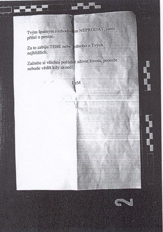 …tento anonym přišel do schránek třem nošovickým rodinám, které nechtěly prodat svá pole, v prosinci 2005. Dopisy dorazily krátce poté, co tehdejší hejtman Evžen Tošenovský v médiích prohlásil, že prodlužuje výkupy o poslední týden – když do neděle všichni nepodepíší, automobilka v Nošovicích stát nebude. Kraj na anonymy zareagoval vysláním policejních hlídek do obce, což však mělo zcela opačný efekt – Stanislav Vojkovský, jeden z majitelů, který nechtěl pozemky pro Hyundai zarytě prodat, říká: „Byl jsem zrovna v Pacově a v hospodě v televizi vidím, jak kolem mého domu v Nošovicích choděj policajti. Tak jsem se raději sebral a odjel to do Ostravy na kraj podepsat… Přece se nenecháme vypálit.“ – Policejní vyšetřování, kdo dopisy poslal, bylo po neúspěšném pátrání odloženo. (Podle jedné z domněnek iniciály ukrývají alibistický podpis „Lidé z Moravy“.)