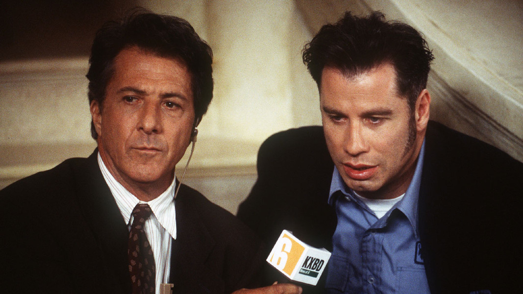Psychologické drama Město šílenců (1997) rozvíjí vděčné téma hollywoodských filmařů, a sice manipulaci veřejného mínění prostřednictvím sdělovacích prostředků. Propuštěný hlídač v muzeu malého kalifornského města Sam Baily (John Travolta) se zoufale snaží dostat zpět svou práci a když nepochodí u ředitelky, stane se řízením různých shod okolností zločincem se skupinou dětských rukojmí. Protřelý reportér, pracující pro místní televizní kanál, Max Brackett (Dustin Hoffman), který je náhodou na místě činu, neváhá a celou situaci začne živě pouštět do éteru. Senzace, jejíž průběh může sám ovlivňovat a která mu jistě pomůže oživit poněkud skomírající kariéru, je na světě. Prostoduchý hlídač si totiž vůbec neuvědomuje dosah svého počínání a navíc ani neví, jak se má v podobné situaci vlastně chovat. Snímek, jehož děj nápadně připomíná cynickou komedii Billyho Wildera Ace in the Hole (1951, Eso v rukávu), těží ze souhry hereckých hvězd Dustina Hoffmana a Johna Travolty, kteří se spolu v jednom filmu objevují poprvé. V dalších rolích zaujmou Alan Alda (prominentní reportér velké televizní společnosti, který nelibě sleduje sólokapra bývalého kolegy, jehož se zbavil) a Blythe Dannerová (ředitelka muzea), která dnes už většinou stojí ve stínu své známější dcery Gwyneth Paltrowové. Jako režisér je pod snímkem podepsán režisér řeckého původu Costa-Gavras (nar. 1933), který proslul ve Francii sérií politicky motivovaných filmů (např. Z, Doznání, Stav obležení) a v Hollywoodu se prosadil působivým dramatem Nezvěstný (1981), odehrávajícím se na pozadí převratu v Chile.