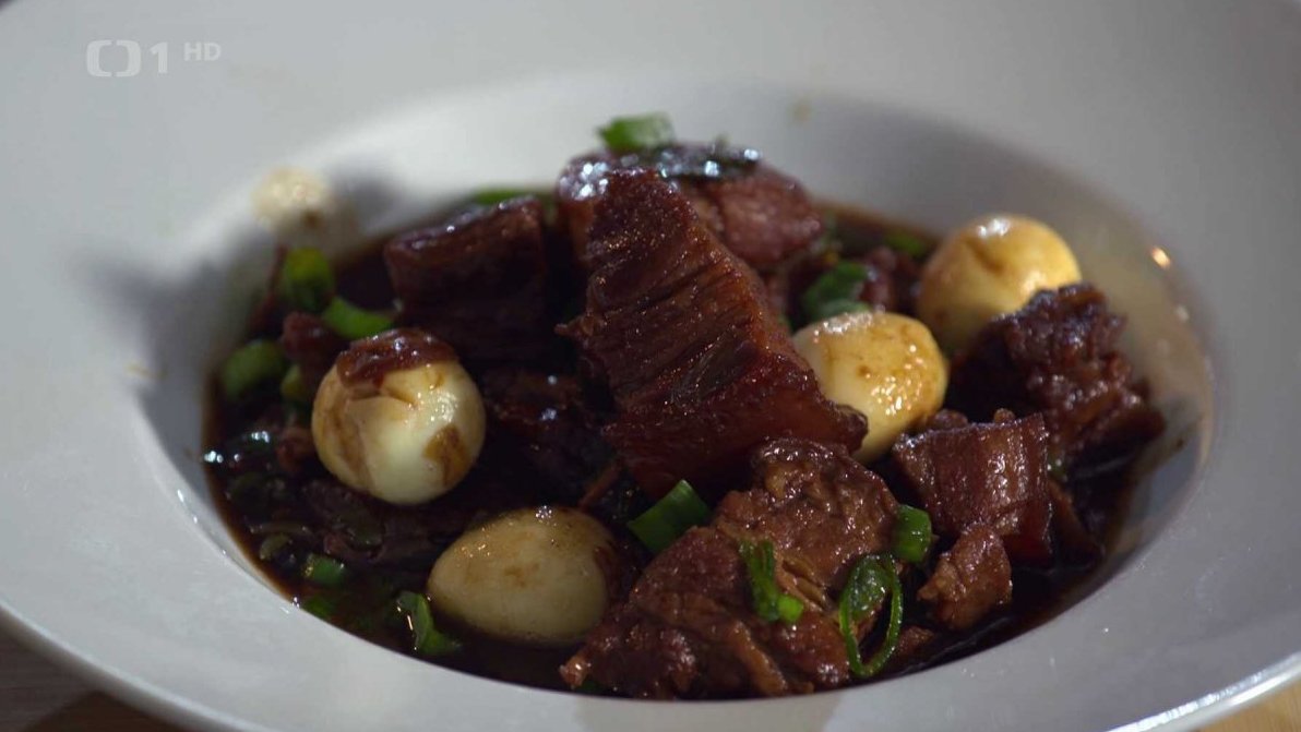 Přidáme sójové omáčky, víno, rýžový ocet, skořici, badyán, bobkový list, chilli papričky, plátky zázvoru, prolisovaný česnek, sečuánský pepř, podlijeme trochou vody a necháme podusit pod pokličkou cca 45 minut.