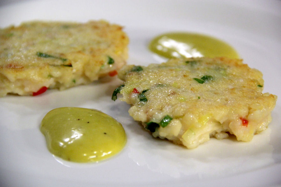 Mezi tím si uděláme speciální majonézu. Do misky dáme žloutek a hořčici. Šleháme a pomalu vléváme olej, až vznikne hustá emulze. Dochutíme solí a limetkovou šťávou.