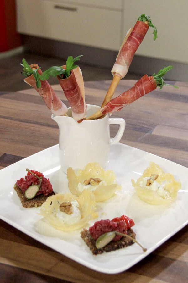 Grissini se Serrano šunkou a parmezánové košíčky s gorgonzolovým krémem