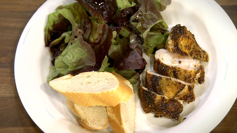 Prsa opečeme z obou stran na rozpálené pánvi. Lístky salátu zakápneme balzamikovým octem a olejem. Nakrájíme prsa a bagetku a podáváme.