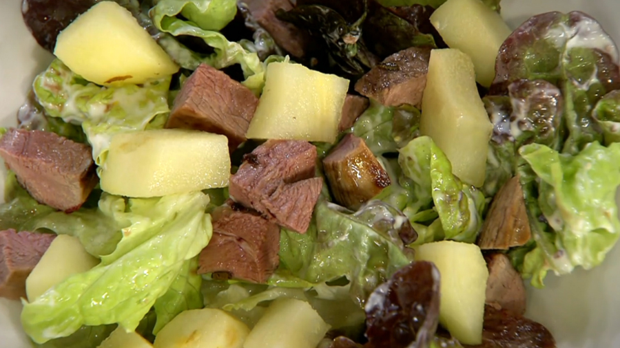 Do misky si dáme bílý jogurt, med, hořčici, smetanu, sůl a promícháme. Lístky salátu natrháme a promícháme s dresinkem. Nakrájená prsa servírujeme se salátem a hruškou.
