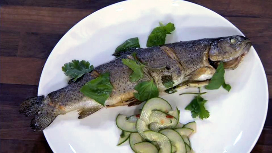 Okurku rozkrojíme, zbavíme jádřince a nakrájíme na půlměsíčky. Salát zalijeme zálivkou z rendlíku a promícháme. Kolečka limety, bazalku a větvičku koriandru dáme dovnitř ryby. Pstruha omotáme provázkem, aby se nám vnitřek nevysypal.