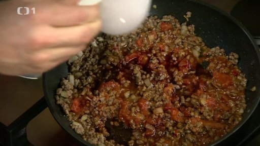 Na olivovém oleji si opečeme nakrájenou cibuli a maso. Přidáme nakrájenou chilli papričku, lžičku mouky, špetku mletého kmínu, tyčinku skořice a 2 lžičky worcesteru. Poté přidáme nakrájená rajčata, rajčatový protlak, sůl a pepř. Dále přidáme červené víno a vývar. Vše povaříme, dokud se nám tekutina nevypaří. Pokračujeme přidáním fazolí. Směs vysypeme do mísy, necháme zchladnout a přidáme nakrájený koriandr.