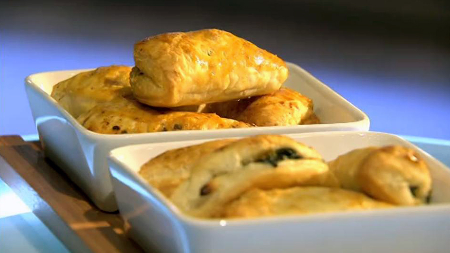 Z těsta si vykrojíme kolečka, která naplníme směsmi. Kraje potřeme vajíčkem, aby se nám těsto dobře lepilo, a vytvoříme uzavřenou kapsu. Těsto propíchneme kvůli unikání páry. Celé ho ještě potřeme vejcem a pečeme 7 minut při 190 stupních.