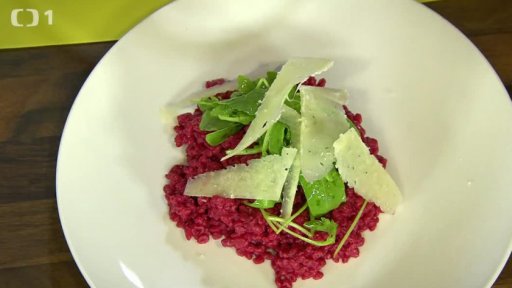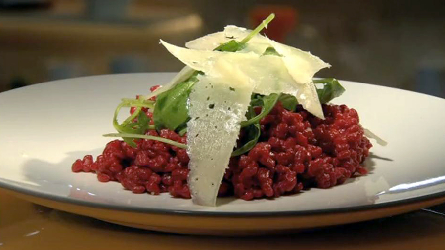Předvařené kroupy opečeme na olivovém oleji a zalijeme šťávou z červené řepy. Pečeme, dokud se nevypaří šťáva. Sýr nakrájíme na drobné kousky a přidáme ke kroupám, v případě potřeby ještě přidáme šťávu. Přímo dovnitř nastrouháme pecorino, zamícháme a přidáme pepř.