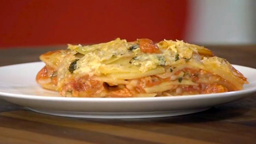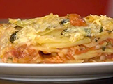 Brambory si oloupeme a nakrájíme na tenké plátky, stejně tak cibuli. Nastrouháme si parmazán. Rajčatovou omáčku dáme na dno kastrolu a přidáme trochu vody. Začneme skládat brambory, na ně dáme vrstvu sýru, sůl a oregáno. Pokračujeme další vrstvou rajčatové omáčky, na kterou dáme rozmačkaný česnek. Poté vrstvíme brambory, parmezán a oregano. Přidáme vodu, olivový olej a 15 minut povaříme. Poté pečeme 15 až 20 minut na 180 °C.