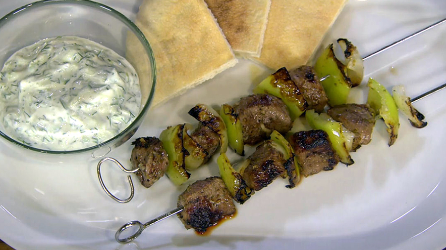 Okurku rozkrojíme, zbavíme jádřince a nastrouháme. Nasolíme ji a necháme odkapat. Maso odblaníme a nakrájíme na kousky. Olivový olej, rozmačkaný česnek, citron a sušené oregano smícháme. Papriku a cibuli nakrájíme na stejně velké kousky jako maso. Nemarinujeme a napícháme na špíz. Okurku ještě vymačkáme, přidáme k ní řecký jogurt, nasekaný kopr, pár kapek octa a rozmačkaný česnek. Maso upečeme a můžeme servírovat.