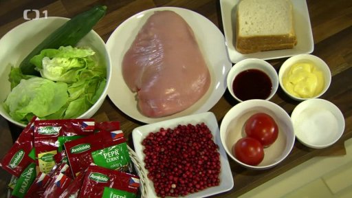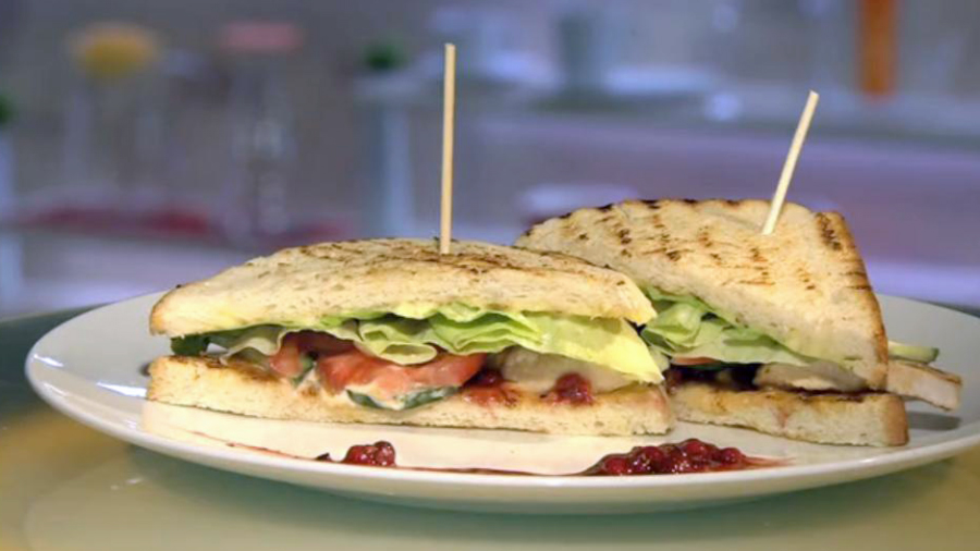 Kuřecí prsa nakrájíme na plátky a opečeme na oleji. Na plátky také nakrájíme okurku a rajčata. Brusinky orestujeme na cukru, poté k nim přidáme marmeládu. Toastový chléb opečeme z obou stran na sucho na pánvi. Opečený chléb namažeme majonézou, položíme na něj maso, které potřeme brusinkami. Obložíme zeleninou a přiložíme majonézou namazaný toastový chléb.