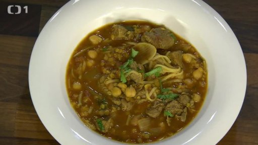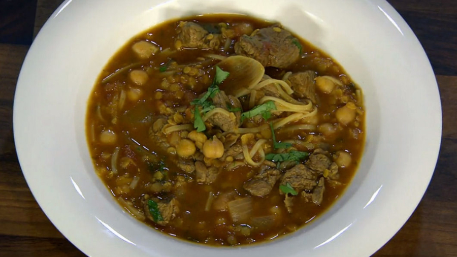 Rajčata spaříme, oloupeme a nakrájíme na kousky. Na malé kousky nakrájíme i maso, nadrobno cibuli. Cibuli s masem společně orestujeme na přepuštěném másle. Přidáme mletý zázvor, kurkumu a skořici. Promícháme, přidáme protlak a rajčata a přilijeme vývar z masa. Petržel a koriandr nasekáme a vhodíme do hrnce. Vaříme 20 minut. Poté přidáme předem namočenou okapanou cizrnu. Šalotku překrojíme na čtvrtky, přidáme a vaříme dalších přibližně 20 minut, než nám změkne cizrna. Těsně před tím, než bude polívka hotová, přidáme nudle. Pak zakápneme citronovou šťávou.