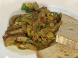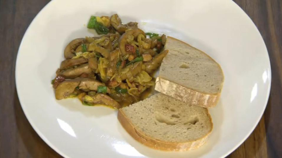 Slaninu si nakrájíme na kostičky, vhodíme do pánve a na sucho opečeme. Krátce vyškvaříme a přidáme nakrájenou cibuli, kterou pečeme, dokud nezesklovatí. Přidáme ledvinky zbavené močových trubic, které jsme nechali přes noc namočené v mléce. Promícháme, přidáme kari, osolíme a opepříme. Přidáme kostku másla. Až se rozpustí, přidáme mandle, zarestujeme a přilijeme víno. Posypeme cibulkou, jíme s chlebem.