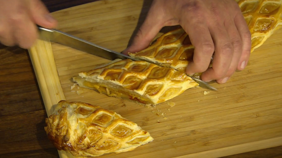 Nakládané papriky oloupeme a nakrájíme. Rozválíme listové těsto a rozprostřeme na něj sýr, papriku, chilli papričku a tuňáka. Opepříme a zabalíme.