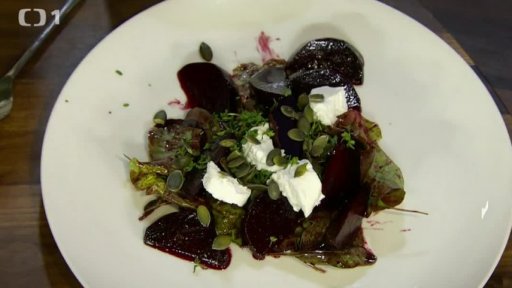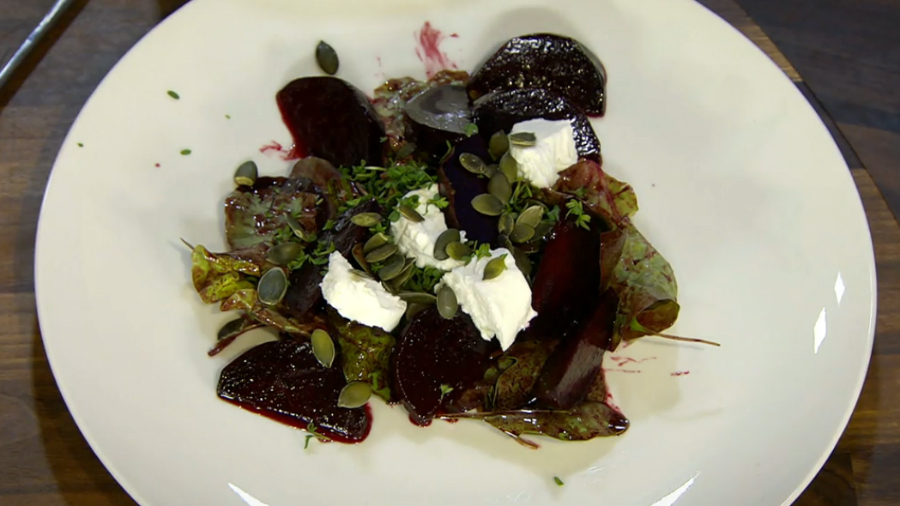 Šťávu z červené řepy přivedeme k varu. Přidáme kardamom a badyán a přilijeme malinový ocet. Tekutinu zredukujeme o třetinu, necháme vychladnout, osolíme a přilijeme do ní olivový a dýňový olej. V míse namarinujeme salát. Zvlášť namarinujeme řepu. Dáme na jeden talíř, posypeme kozím sýrem, dýňovými semínky a řeřichou. Závěrem pokapeme medem.