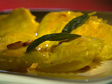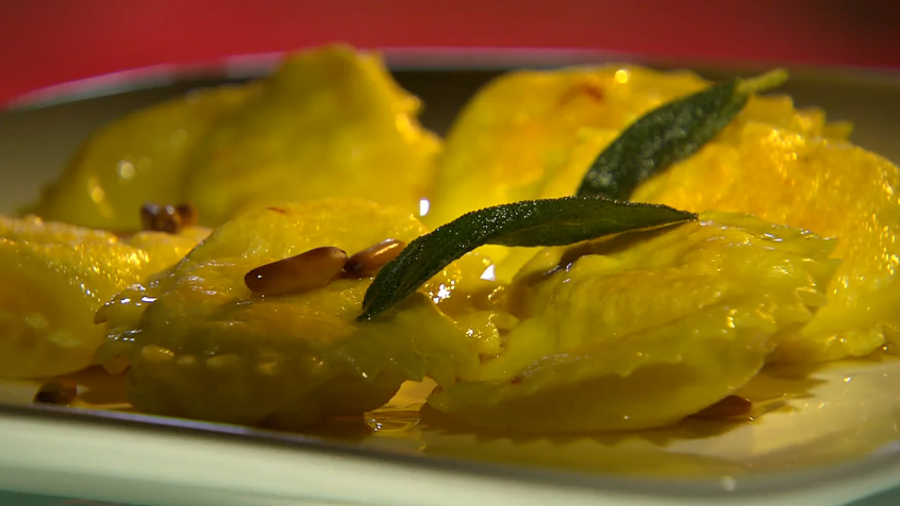 Z těsta vykrojíme ravioly, do nichž dáme rybí fáš. Ravioly vaříme ve vroucí vodě 2 až 3 minuty, pak je opečeme na přepuštěném másle. Při pečení máme v pánvi i lístek šalvěje a oříšky.