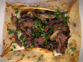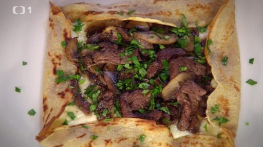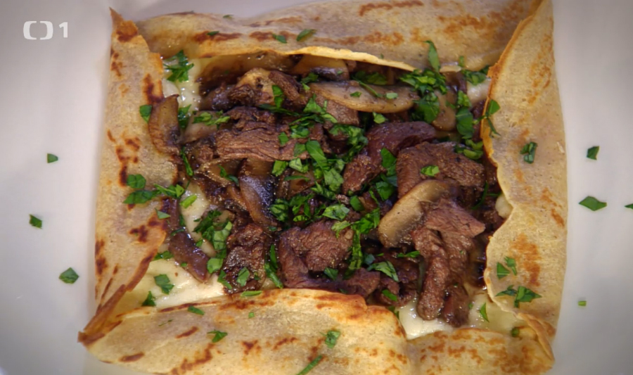 Palačinku potřeme bešamelem a vyskládáme masem. Pečeme v troubě 5 až 7 minut na 200 °C.