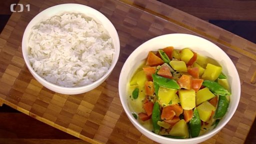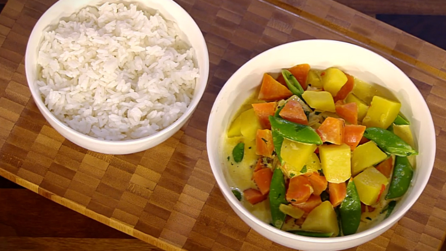 Brambory a mrkev nakrájíme, vhodíme do pánve a podusíme téměř do měkka. Přilijeme kokosové mléko a sojovou alternativu ke smetaně. Nakonec přidáme hrášek a koriandr. Provaříme a můžeme servírovat.
