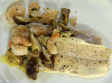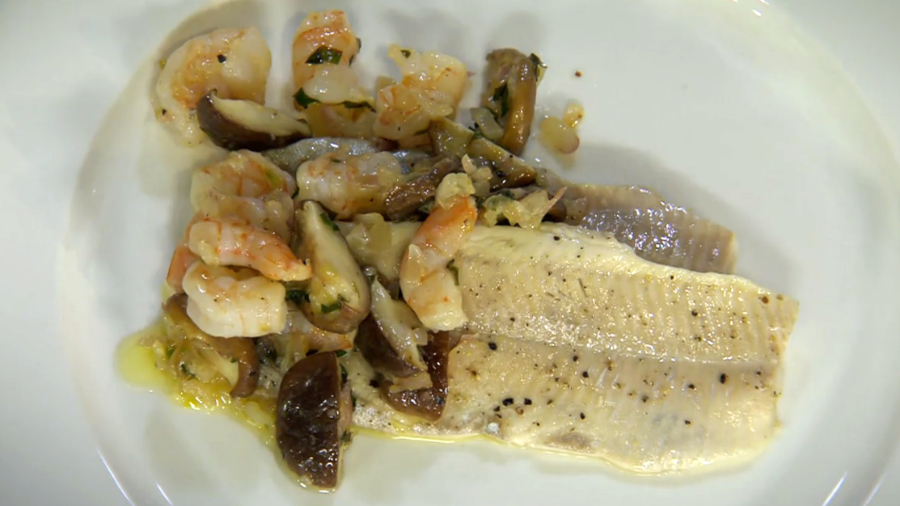Ze sivena si udělejte filety a vykostěte je. Čisté filety potřete olejem, zabalte do potravinářské fólie a dejte vařit na páře. Na pánvi rozehřejte máslo, dejte restovat šalotku a nakrájené houby. Přidejte krevety, estragon a citrónovou šťávu. Osolte a opepřete. Z uvařeného sivena sloupněte kůži, osolte a opepřete a podávejte s připraveném ragú.